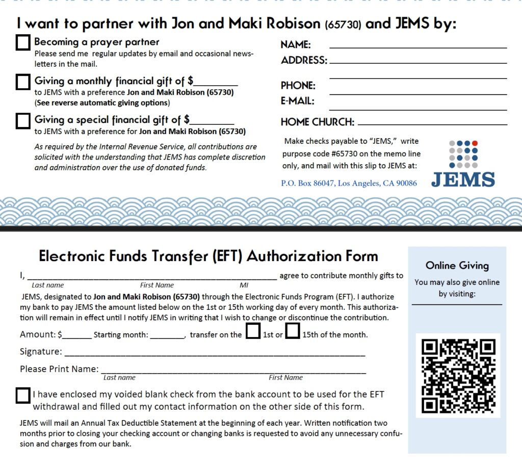 Online Giving is available at JEMS.org. It takes only 5 minutes to set up! You can use Visa, AmericanExpress or Mastercard. You can stop the monthly giving anytime by contacting JEMS (213)-613-0022 or contact info@jems.org